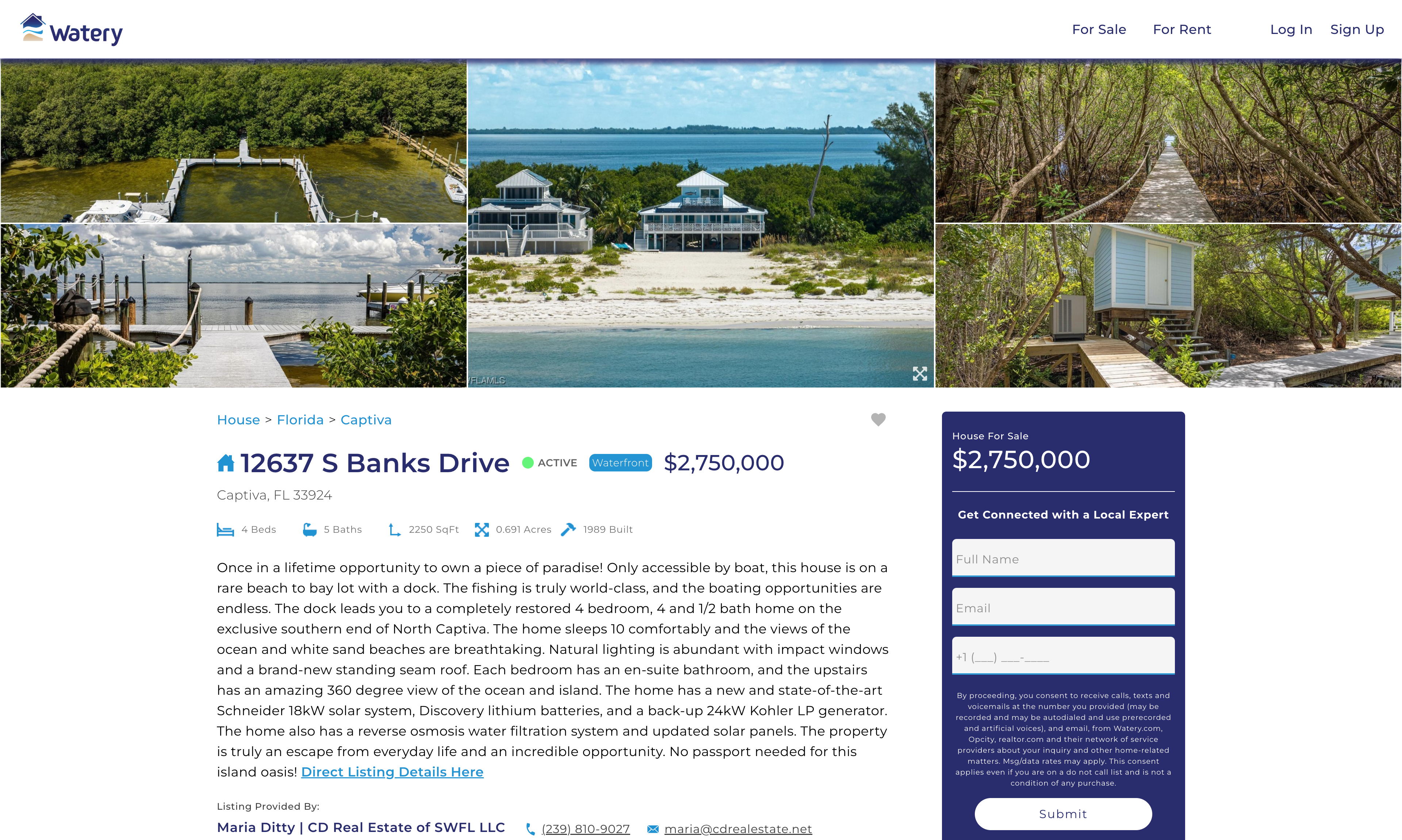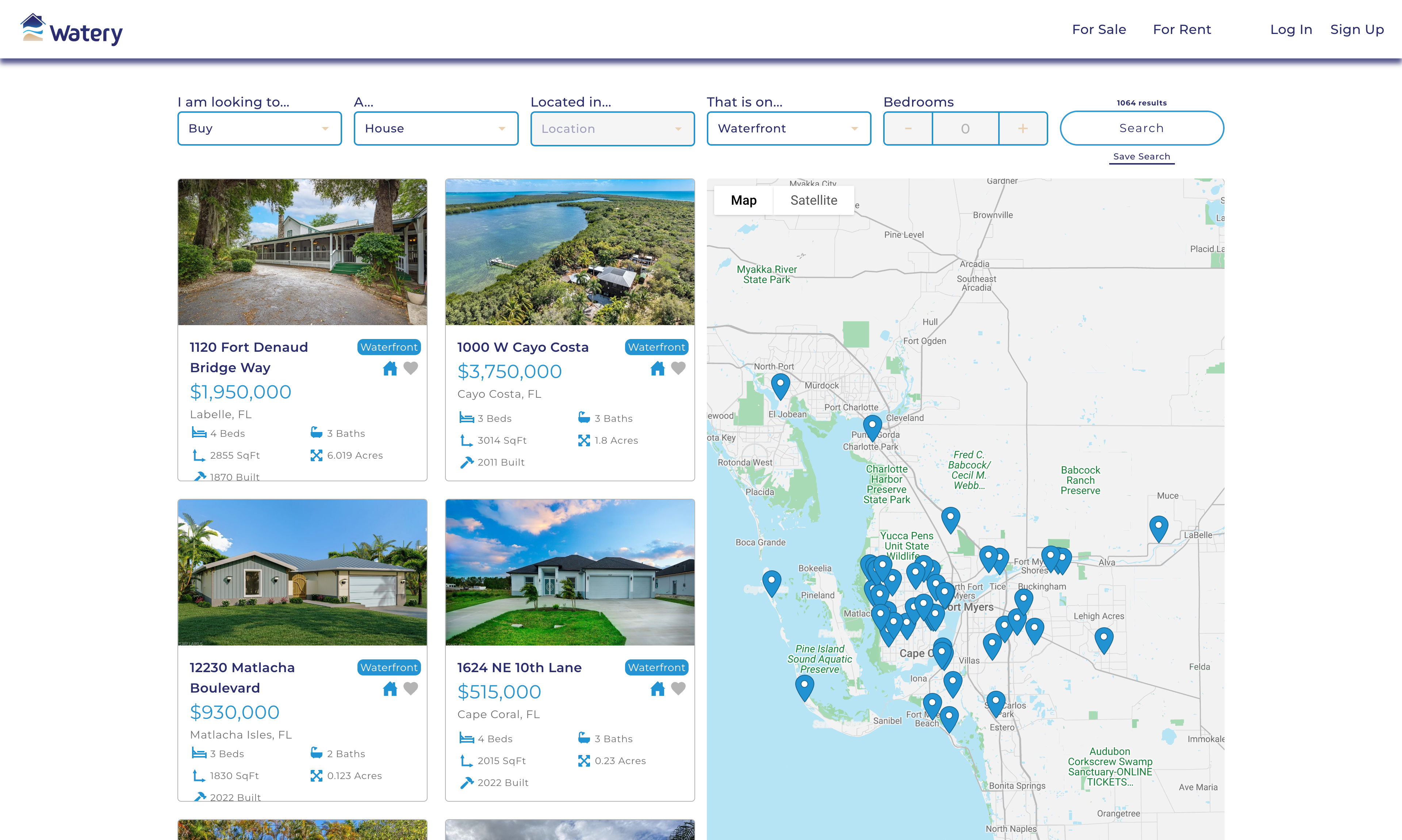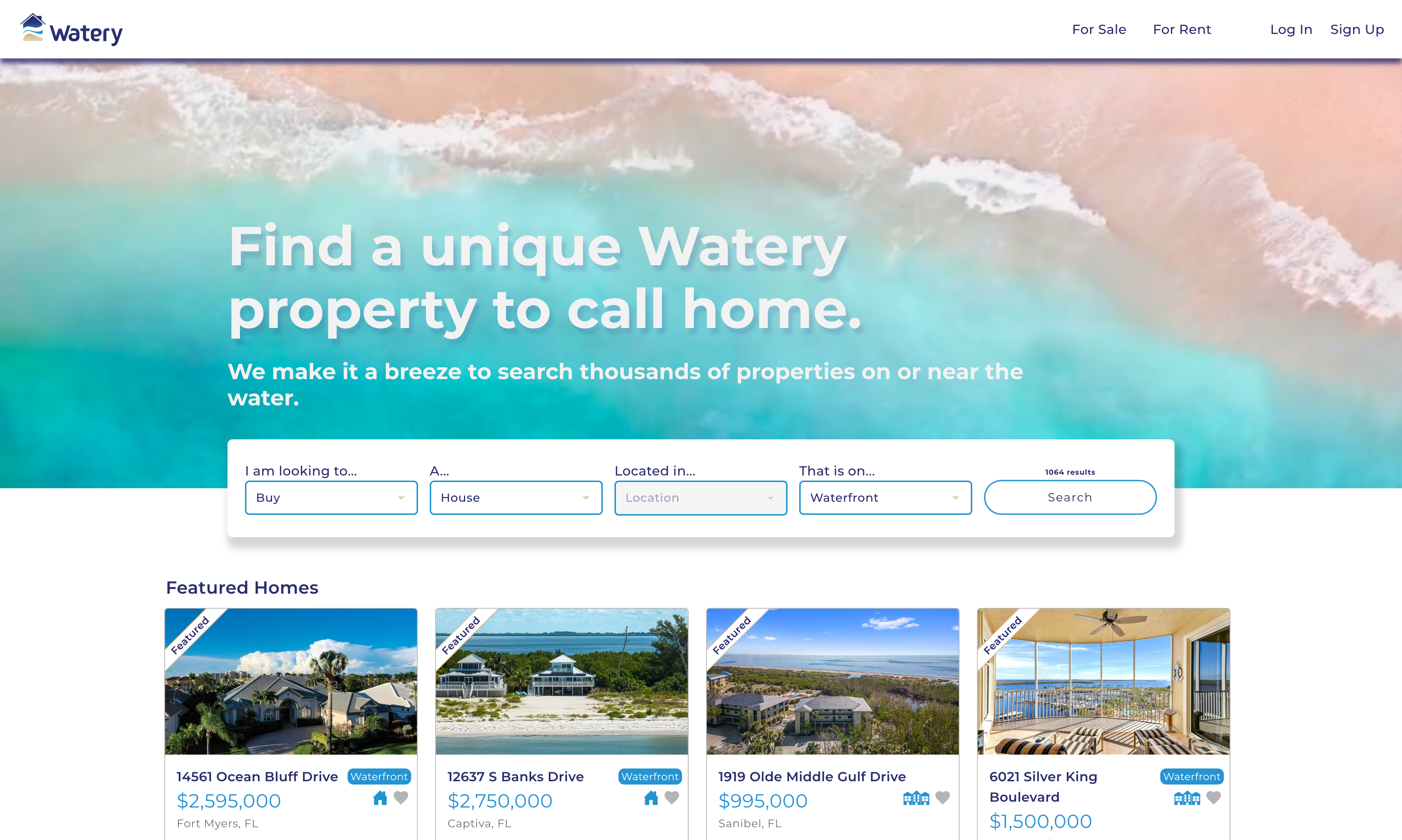 Watery is a dedicated real estate website focusing on properties situated near water bodies. The site features a comprehensive search function, allowing users to find listings in a specified city based on certain criteria, including the number of bedrooms and bathrooms, among other specifics.